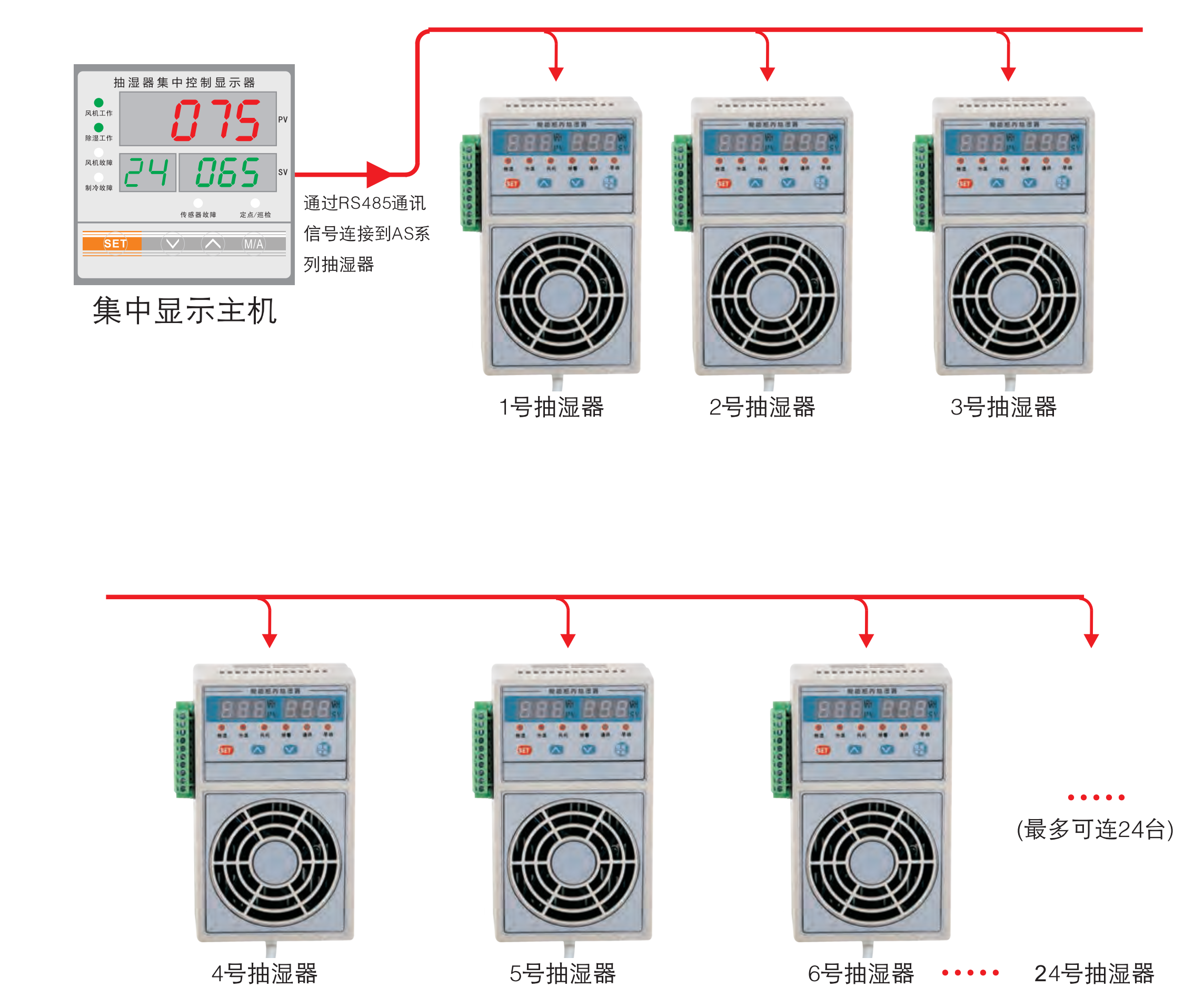 設(shè)置濕度減去10%RH,除濕功能自動(dòng)停止,同時(shí)除濕指示燈、風(fēng)機(jī)指示燈關(guān)閉。